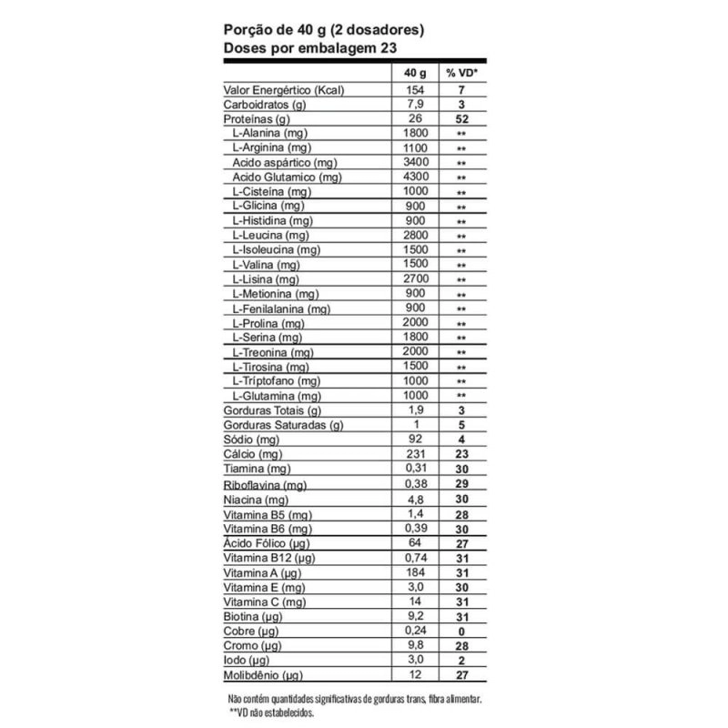 - Formulação exclusiva com alta concentração de aminoácidos, especialmente BCAAs, com alto valor biológico.